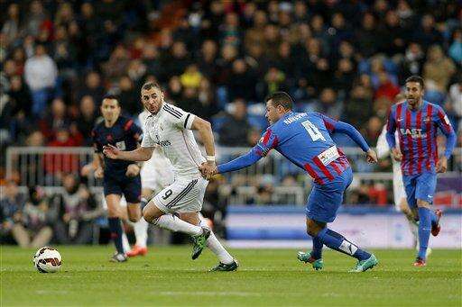 Real Madrid's Karim Benzema, left, is grabbed by the shirt while he duels for the ball with Levante’s Navarro during a Spanish La Liga soccer match between Real Madrid and Levante at the Santiago Bernabeu stadium in Madrid, Spain, Sunday, March 15, 2015. (AP Photo/Daniel Ochoa de Olza) The Associated Press