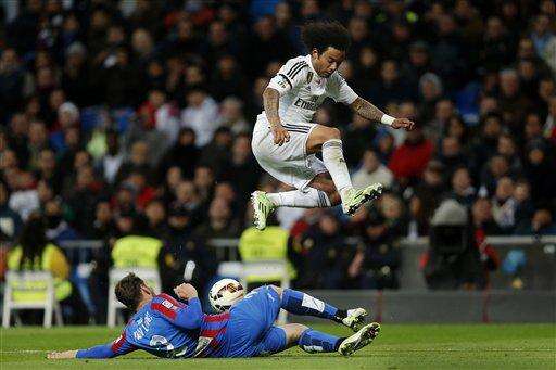 Real Madrid's Marcelo, up, duels for the ball with Levante’s Ivan Lopez during a Spanish La Liga soccer match between Real Madrid and Levante at the Santiago Bernabeu stadium in Madrid, Spain, Sunday, March 15, 2015. (AP Photo/Daniel Ochoa de Olza) The Associated Press