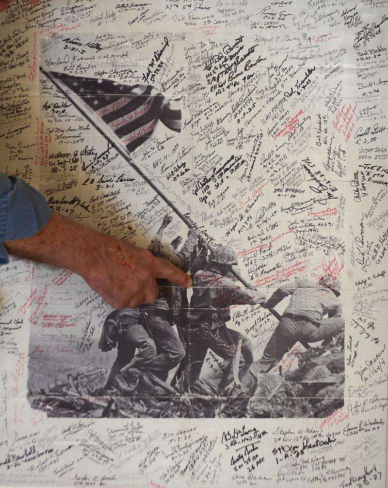 The first batch of signatures - in black marker - include that of Pulitzer Prize-winning photographer Joe Rosenthal, who took the iconic image of six U.S. soldiers raising the American flag on the island, Thompson said. The poster was printed for the 50th anniversary of the battle and signed by veterans who fought there.