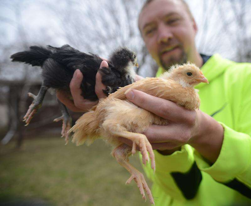 Resident Pete Mangan said his nearly month-old chickens seemed to take well to his backyard coop on Thursday, right after the structure was inspected by the city.