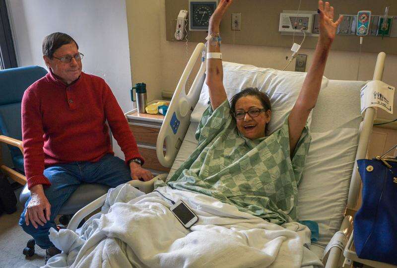 Isobel Short celebrates with husband Jerry after her liver transplant. "I want to give the young person who gave me this liver the biggest hug and let them know how grateful I am," she said. Washington Post photo