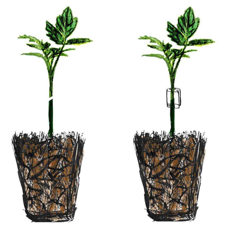 In grafting, a tomato variety chosen for size, color, flavor or heirloom status, left, is paired with a rootstock plant that provides disease resistance and vigor. After the plant has two to four leaves, the graft is made, cutting both plants on the same angle, pairing the desired leaf portion with the desired root portion. The wound is covered with a clip or tube and after a week in controlled conditions, the graft can be planted. Washington Post illustration by Susana Sanchez-Young