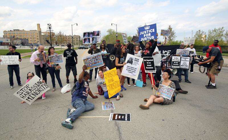 Protesters blocked streets in Waukegan Friday afternoon. Demonstrators were also stopping traffic on Sheridan Road in Waukegan to protest the decision by Lake County State's Attorney Michael Nerheim not to file charges in the April police shooting of teen Justus Howell in Zion.
