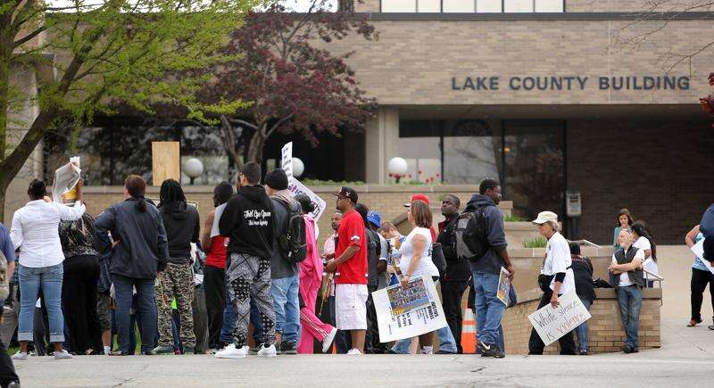 Protesters rally in front of the Lake County Building in response to State's Attorney Michael Nerheim decision that a Zion police officer was justified in fatally shooting teenager Justus Howell last month.