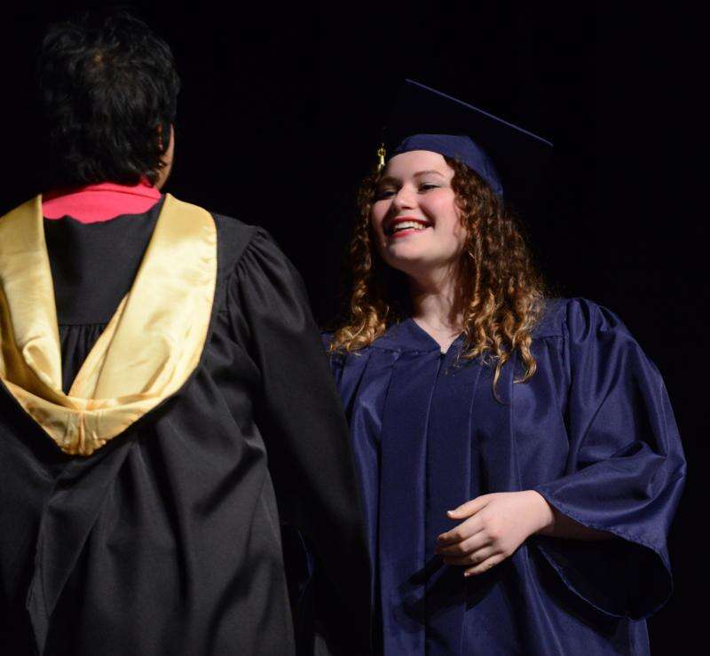 Left to right, Alyssa DeSimone, Moses Diaz and Alma Domazet smile and face the audience during the processional of the East Leyden High School graduation at the Rosemont Theatre Tuesday.