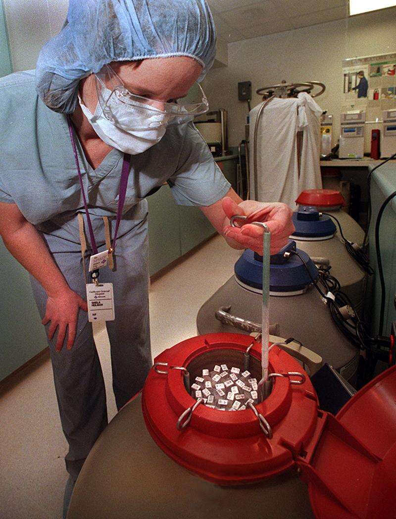 In this file photo, an embryologist checks on frozen embryos stored at Lutheran General Hospital in Park Ridge. Some couples struggle with the decision of what to do with extra frozen embryos. Daily Herald file photo