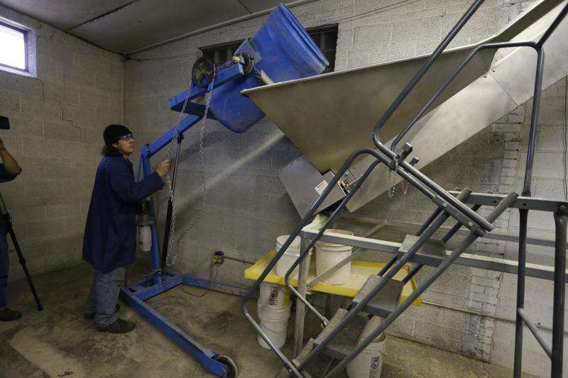 A technician feeds a barrel of shredded hemp into a hopper on the way to being turned into pulp and used for paper and other products, at Pure Vision Technology, a biomass factory in Ft. Lupton, Colo. The newly legal hemp industry is entering its second growing season with some big questions for producers experimenting with marijuana's non-intoxicating cousin.