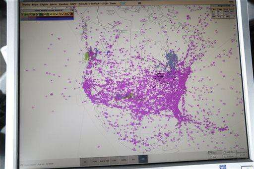 A computer screen shows all air traffic in real time over North America in the control tower at O'Hare International Airport. The Associated Press