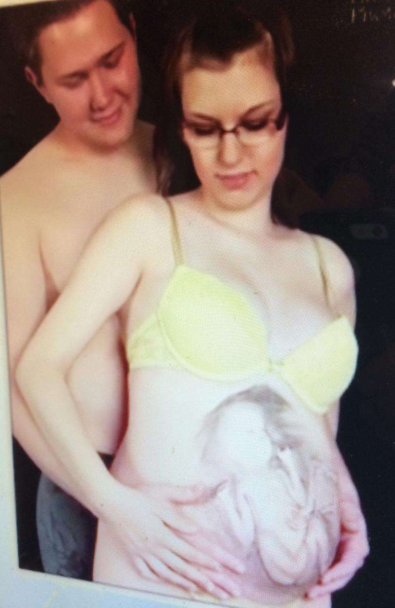 Not quite as serious as the couple in Grant Wood's "American Gothic," a shirtless man and pregnant woman wearing a bra celebrate her pregnancy by staring at a charcoal drawing of a lifelike fetus on her belly in a piece titled "Drawn Together."
