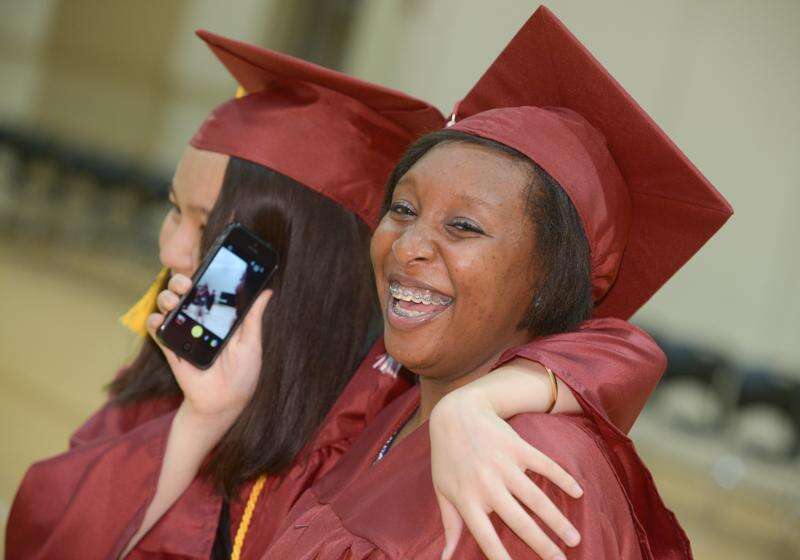 Graduates Sarah Cowell and Jessica Austriaco perform the duet "When You Believe" during the Wheaton Academy graduation Sunday at Wheaton Bible Church in West Chicago.
