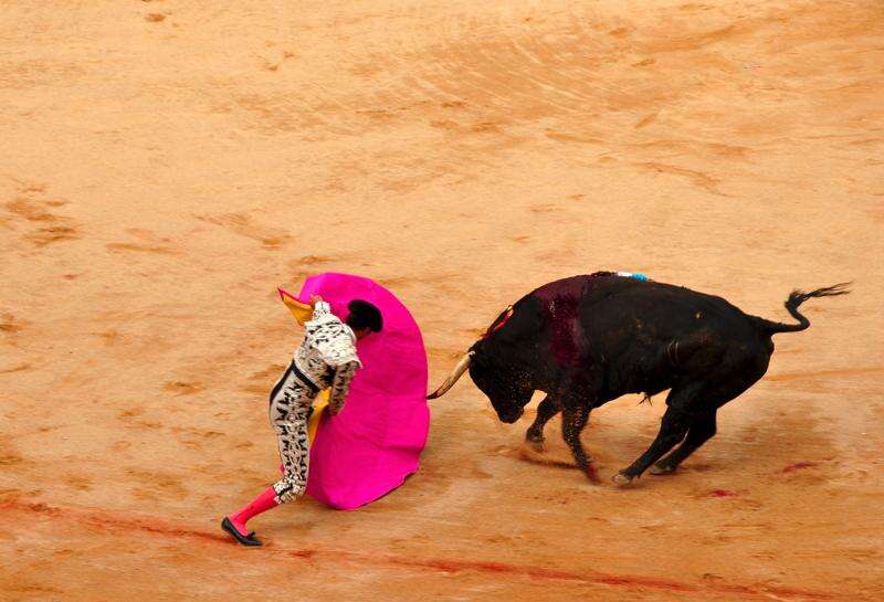 Three matadors take turns facing two bulls apiece. First, a bull's speed and agility are tested as it charges a large pink cape, then a picador on a blindfolded horse stabs the bull with a lance to weaken its neck muscle. Barbed spears are jabbed into the bull's shoulder muscles. Alone in the ring, the matador twirls a small, red cape before the weakened animal, taunting it to charge. The more skilled the matador, the closer the horns come to his body. Injuries are not uncommon. The bull dies when a sword is plunged into its heart. The whole process, by tradition, must take no more than 22 minutes.