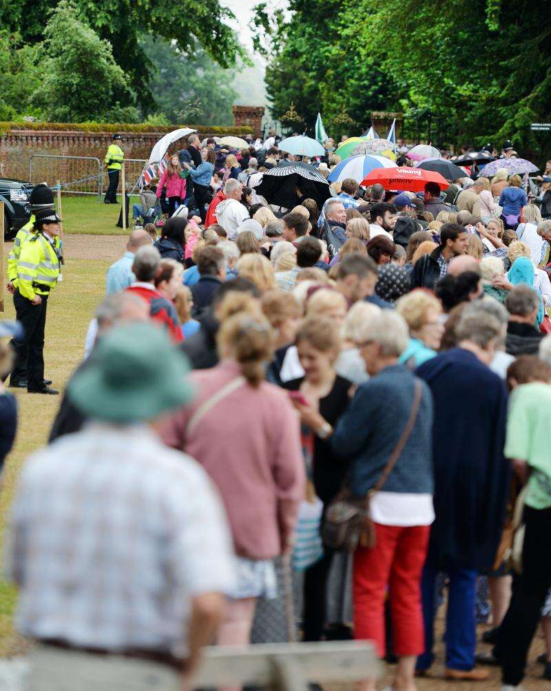 A large crowd of royal fans pass through security to the area around the Church of St Mary Magdalene in Sandringham, eastern England, where Princess Charlotte will be christened in front of the Queen and close family, Sunday. The church, close to William and Kate's country house Anmer Hall, is where the royal family traditionally gathers for Christmas service. It is also where Charlotte's late grandmother, Princess Diana, was christened in 1961.