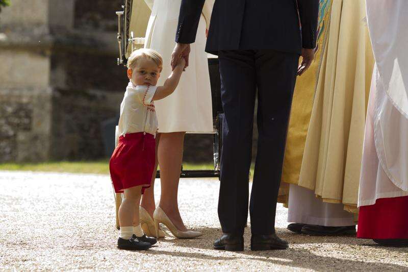 Britain's Prince George stands with his parents as they leave Sunday after attending the christening of his sister Princess Charlotte at St. Mary Magdalene Church in Sandringham, England.