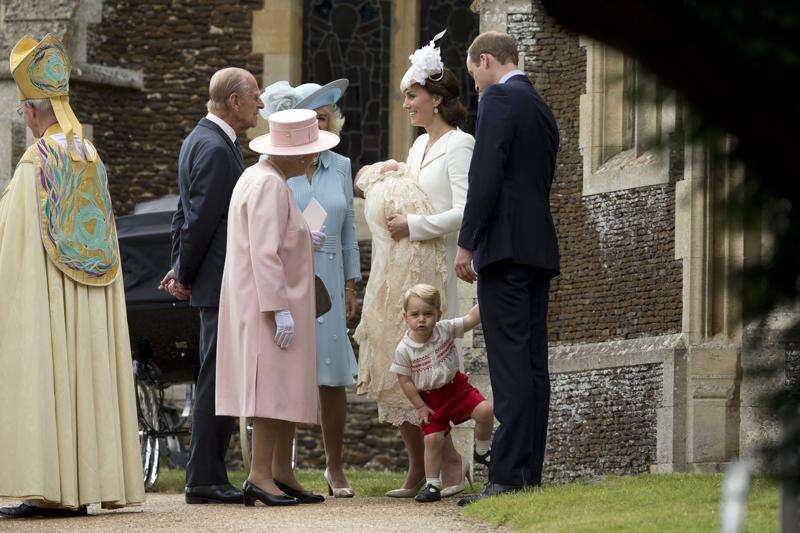 Kate, the Duchess of Cambridge, center, right, holding their daughter Princess Charlotte of Cambridge stands next to Britain's Prince William, Duke of Cambridge, holding their son Prince George of Cambridge's hand, as they talk to Britain's Queen Elizabeth II, left, and Prince Phillip and Camilla, Duchess of Cornwall, after the christening of Charlotte Sunday at St. Mary Magdalene Church in Sandringham, England.