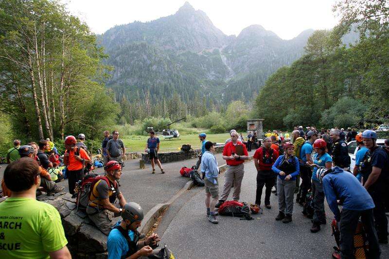 Search and Rescue volunteers gather at a staging area, Monday, after the Big Four ice caves collapsed. Associated Press