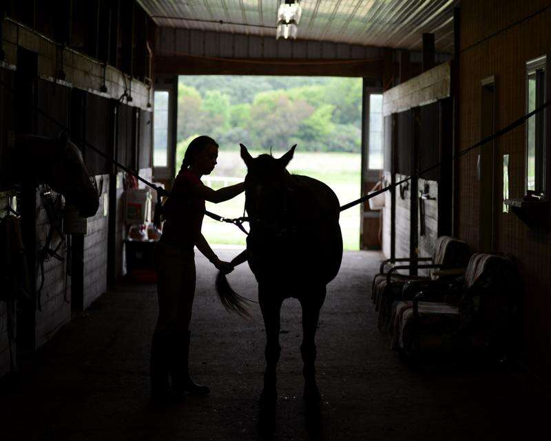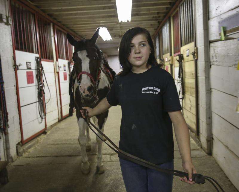 Sonia Szulik, 13, of Arlington Heights gets ready to tack up a horse at Tower Hill Stables in Hampshire Thursday. Szulik volunteers to help out around the stables with the horses and in exchange gets to ride for free. Rick West/rwest@dailyherald.com
