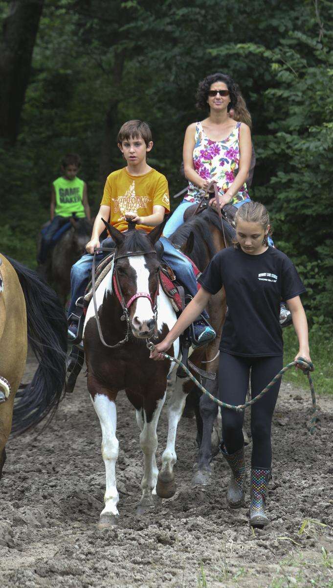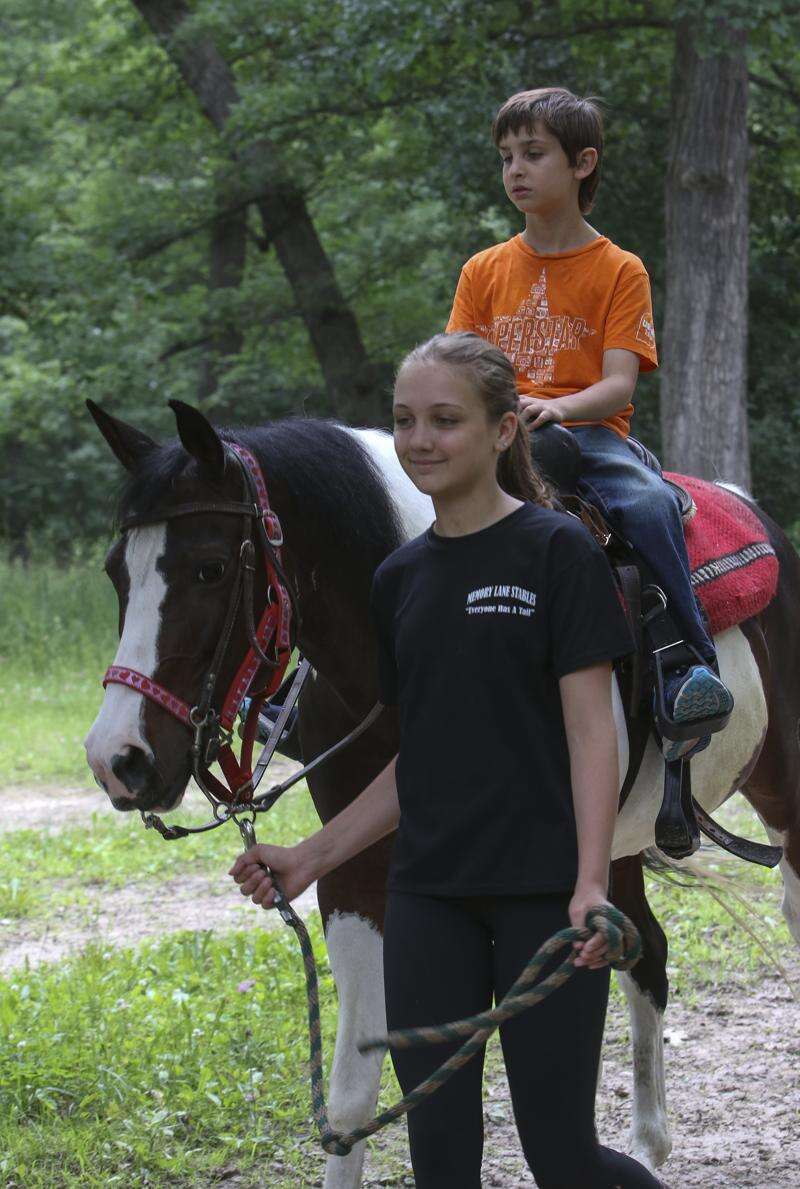 Natalie Przedpelski, 13, leads Elias Baldwin, 8, out on a pony as his mom, Polly Baldwin, rides behind him, at Memory Lane Stables in Willow Springs. Bev Horne/bhorne@dailyherald.com