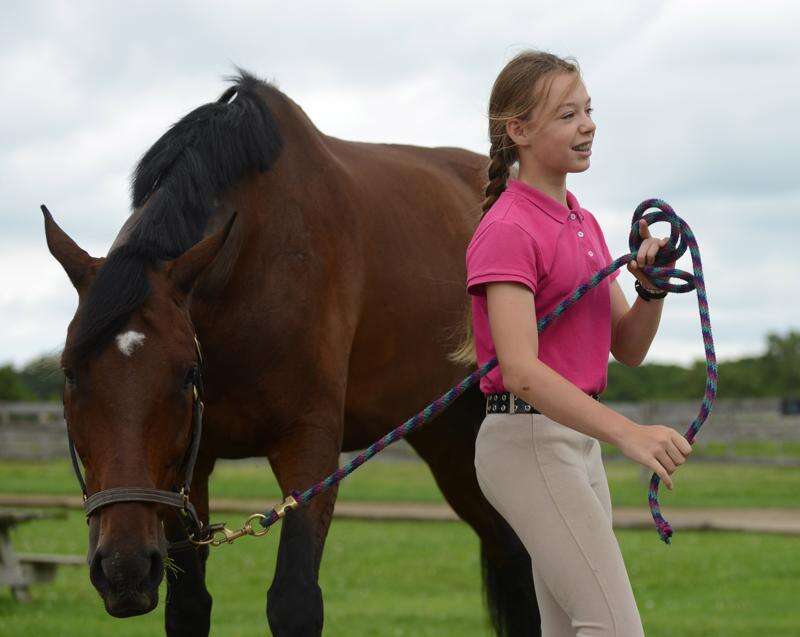 Sonia Szulik, 13, of Arlington Heights takes her favorite horse Oakley out to graze at Tower Hill Stables in Hampshire Thursday. Szulik volunteers to help out around the stables with the horses and in exchange gets to ride for free. Rick West/rwest@dailyherald.com