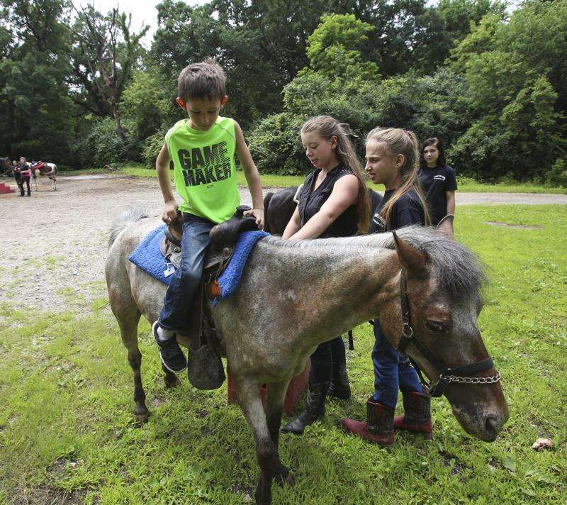 Caleb Baldwin, 6, gets set on a pony called Cupcake with the help of Samantha Kelley, center, and Brianna Palumbo, 11, right, at Memory Lane Stables in Willow Springs. Bev Horne/bhorne@dailyherald.com