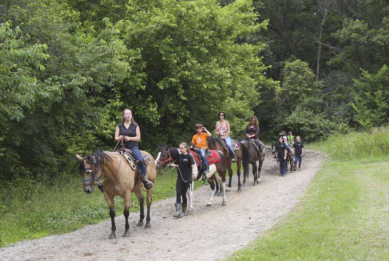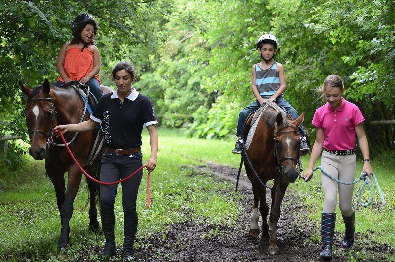 Sara Sofia Guthmann, 7, and Caleb Baldwin, 6, are led on a trail ride at Tower Hill Stables in Hampshire Thursday. Horseback riding instructor Sana Abbas, left and volunteer Sonia Szulik led them on their ride. Rick West/rwest@dailyherald.com