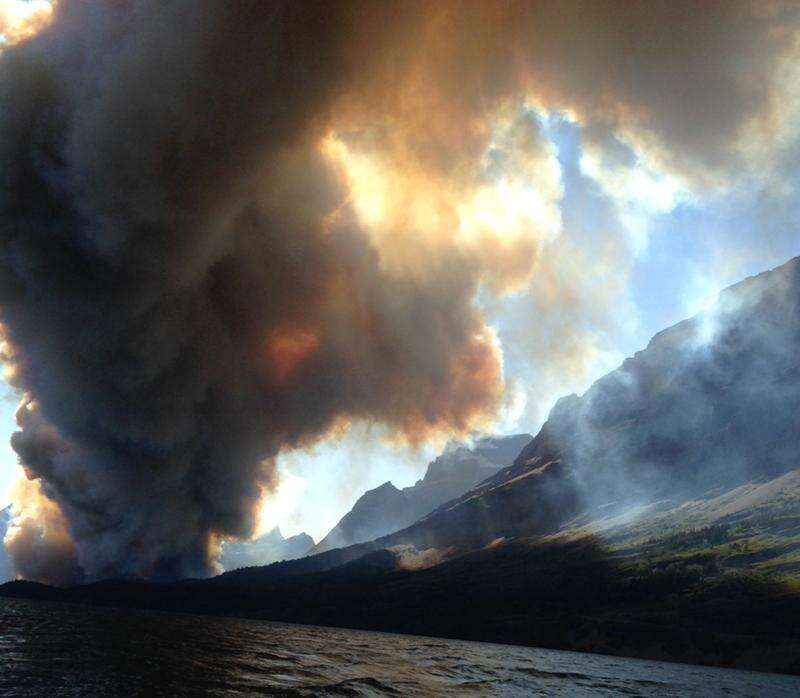 Smoke from the the Reynolds Creek wildefire rises above the landscape Tuesday at St. Mary Lake in Glacier National Park, Mont. The fast-moving wildfire torched a car and forced tourists to abandon their vehicles on the Montana park's most popular roadway.