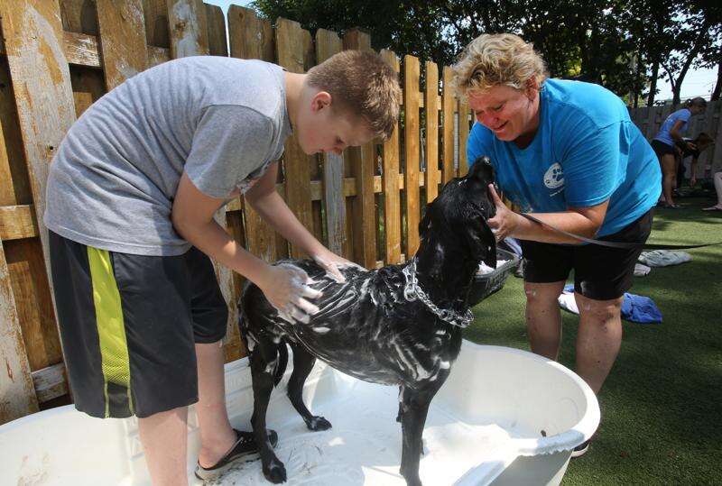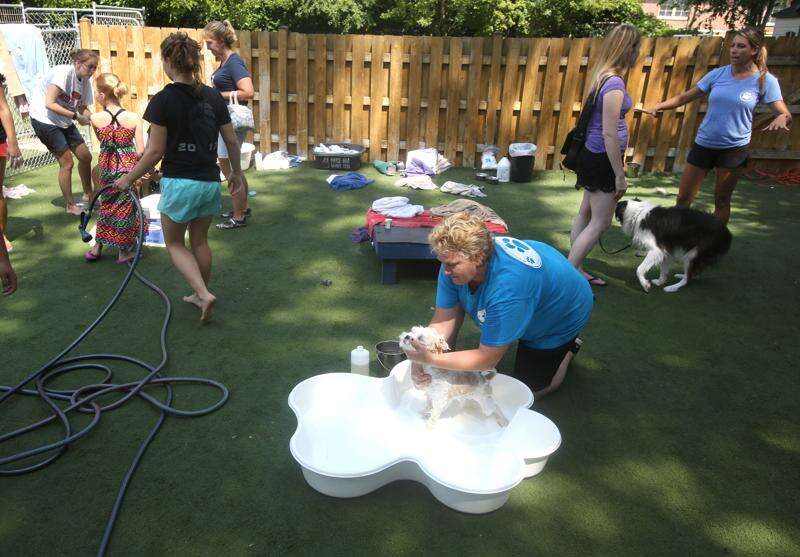 Katy Cushing, center, bathes a dog during a Charity Dog Wash and Adoption Event held Saturday at Closer Bond Dog Training in Palatine. Daniel White/dwhite@dailyherald.com