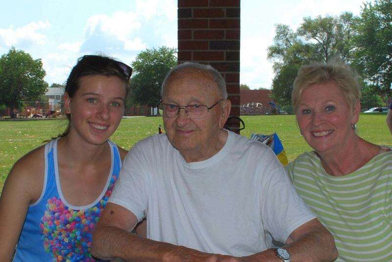At last Sunday's picnic, Art Grewe, 107, has a photo taken with his grandniece Sally Cihock, right, and Nicole Cihock. the family picnics started in 1935. Courtesy of Paul Liston