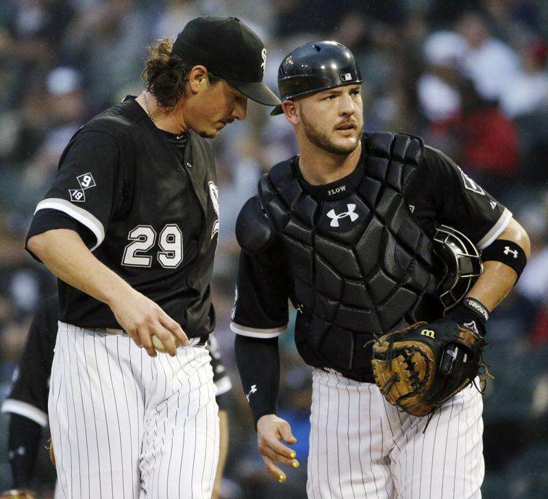 Chicago White Sox starter Jeff Samardzija, left, and catcher Tyler Flowers react as they wait for pitching coach Don Cooper during the first inning of a baseball game against the Seattle Mariners Saturday, Aug. 29, 2015, in Chicago. (AP Photo/Nam Y. Huh)