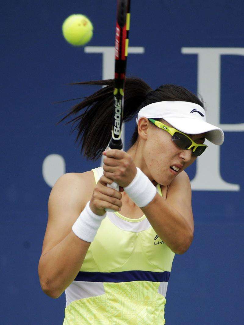 Zheng Saisai, of China, returns a shot to Madison Brengle, of the United States, during the first round of the U.S. Open tennis tournament, Monday, Aug. 31, 2015, in New York. (AP Photo/Frank Franklin II)