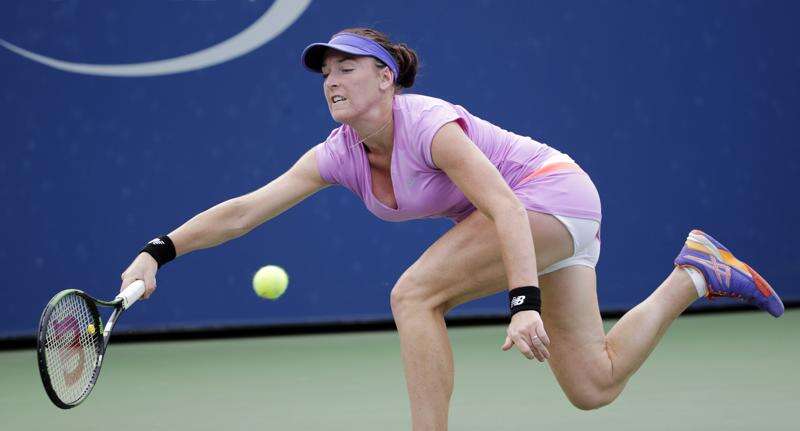 Dominika Cibulkova, of Slovakia, returns a shot to Ana Ivanovic, of Serbia, during the first round of the U.S. Open tennis tournament, Monday, Aug. 31, 2015, in New York. (AP Photo/Matt Rourke)