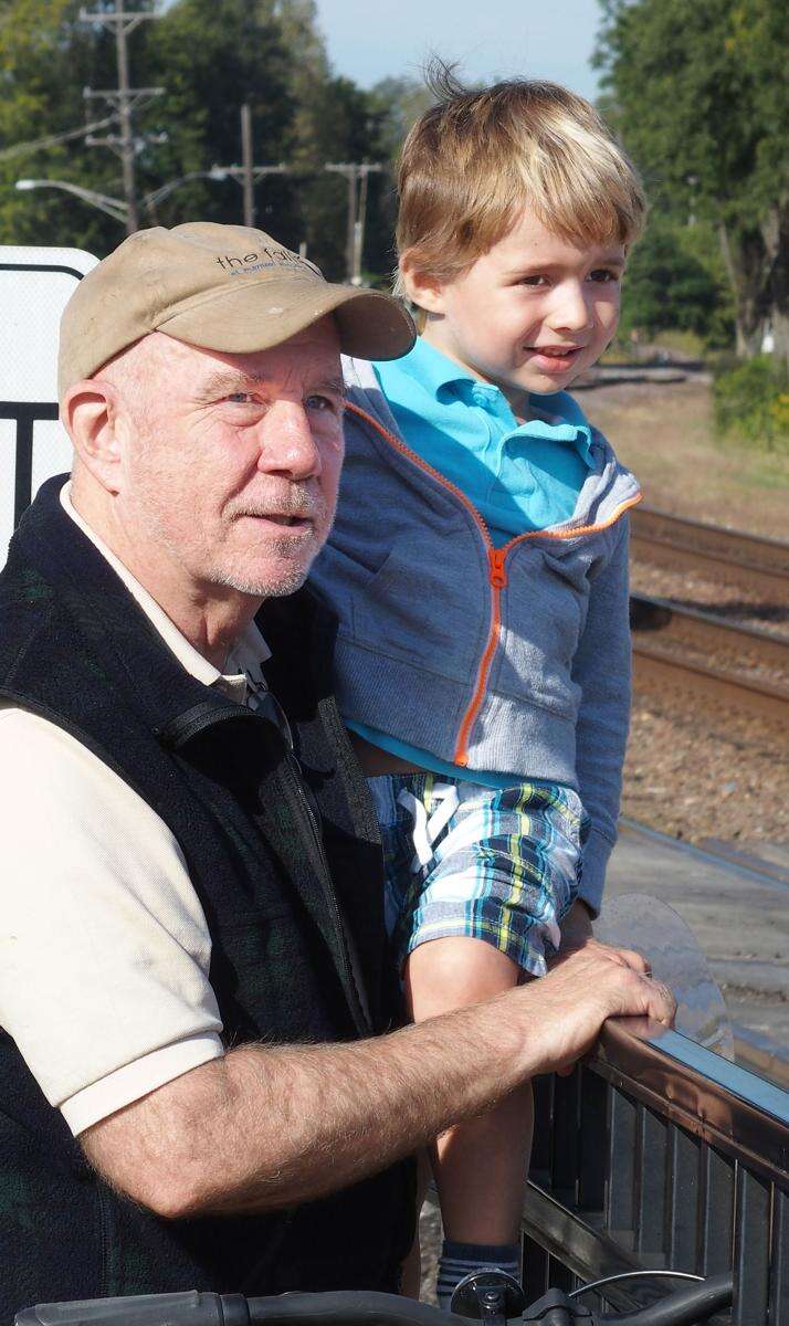 Glen Ellyn residents Dennis Streicher, 3, and his grandpa Max Streicher, take in the action Tuesday at the closing of the Main Street railroad crossing in Glen Ellyn. Scott Sanders/ssanders@dailyherald.com