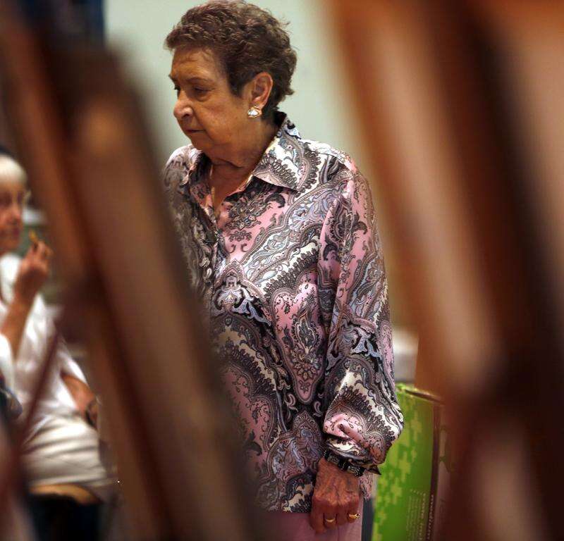 Angela Greenwood of West Dundee looks over some of the paintings Saturday during the Dundee Township Park District Fall Art Show in the Senior Center wing at the Rakow Center in Carpentersville. Brian Hill/bhill@dailyherald.com