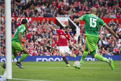 LONDON (AP) - Manchester clubs traded places at the top of the Premier League on Saturday, after a buoyant United beat Sunderland 3-0 and early pacesetter City slipped to second after being thrashed 4-1 at Tottenham.