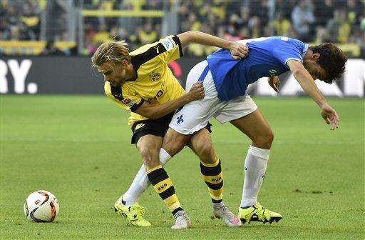 Darmstadt’s Gyorgy Garics, right, and Dortmund's Marcel Schmelzer challenge for the ball during the German Bundesliga soccer match between Borussia Dortmund and SV Darmstadt in Dortmund, Germany, Sunday, Sept. 27, 2015. (AP Photo/Martin Meissner) The Associated Press