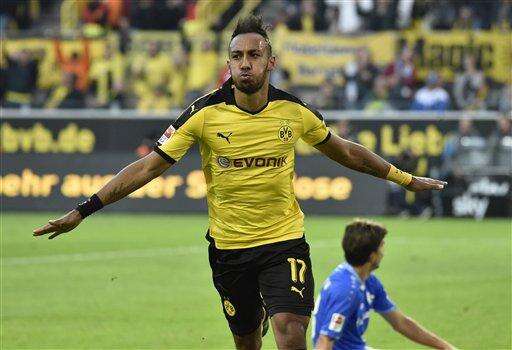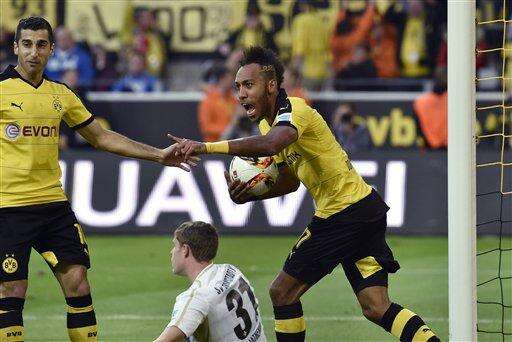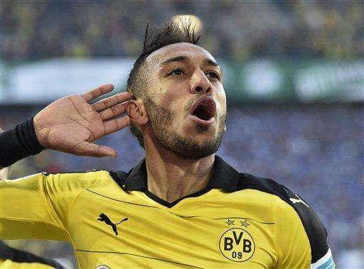 Dortmund's Pierre-Emerick Aubameyang celebrates after scoring his second goal during the German Bundesliga soccer match between Borussia Dortmund and SV Darmstadt in Dortmund, Germany, Sunday, Sept. 27, 2015. (AP Photo/Martin Meissner) The Associated Press