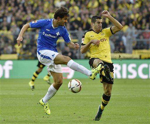 Darmstadt’s Gyorgy Garics, left, and Dortmund's Henrikh Mkhitaryan challenge for the ball during the German Bundesliga soccer match between Borussia Dortmund and SV Darmstadt in Dortmund, Germany, Sunday, Sept. 27, 2015. (AP Photo/Martin Meissner) The Associated Press