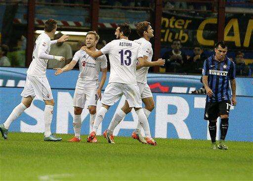 Fiorentina’s Nikola Kalinic, right, celebrates with his teammates after scoring during the Serie A soccer match between Inter Milan and Fiorentina at the San Siro stadium in Milan, Italy, Sunday, Sept. 27, 2015. (AP Photo/Antonio Calanni) The Associated Press