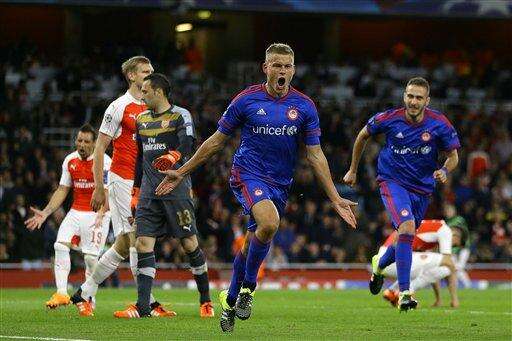 Olympiakos' Alfred Finnbogason, centre, celebrates after scoring his side's third goal during the Champions League Group F soccer match between Arsenal and Olympiakos at Emirates stadium in London Tuesday, Sept. 29, 2015. (AP Photo/Kirsty Wigglesworth) The Associated Press