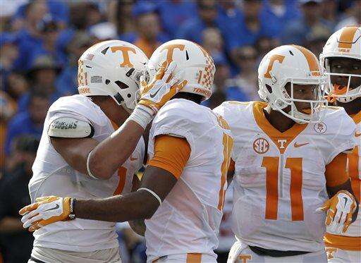 Tennessee running back Jalen Hurd, left, celebrates his 1-yard touchdown run against Florida with teammates wide receiver Jauan Jennings, center, and quarterback Joshua Dobbs (11) during the first half of an NCAA college football game, Saturday, Sept. 26, 2015, in Gainesville, Fla. (AP Photo/John Raoux) The Associated Press