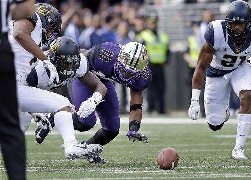 Washington wide receiver Isaiah Renfro (18) watches his fumble as California defenders Hardy Nickerson, left, Darius Allensworth and Stefan McClure (21) surround the ball during the first half an NCAA college football game Saturday, Sept. 26, 2015, in Seattle. Allensworth recovered for Cal. (AP Photo/Elaine Thompson) The Associated Press