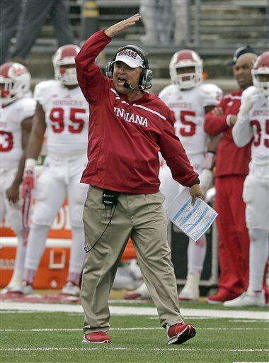 Indiana head coach Kevin Wilson argues a call during the second half of an NCAA college football game against Wake Forest in Winston-Salem, N.C., Saturday, Sept. 26, 2015. Indiana won 31-24. (AP Photo/Chuck Burton)