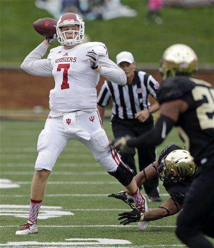 Indiana's Nate Sudfeld (7) looks to pass against Wake Forest during the first half of an NCAA college football game in Winston-Salem, N.C., Saturday, Sept. 26, 2015. (AP Photo/Chuck Burton)