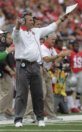 Ohio State head coach Urban Meyer shouts to his team during the first quarter of their NCAA college football game against Western Michigan, Saturday, Sept. 26, 2015, in Columbus, Ohio. (AP Photo/Jay LaPrete)