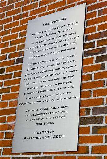 In this Saturday, Sept. 26, 2015 photo, The promise made by Tim Tebow is seen on a plaque at Ben Hill Griffin Stadium before an NCAA college football game between Florida and Tennessee in Gainesville, Fla. It’s been seven years since Tim Tebow delivered a heartfelt apology following a 31-30 home loss to Mississippi, a stunning upset that ended Florida’s undefeated season and spearheaded the team’s run to a second national championship in three years. (AP Photo/John Raoux) The Associated Press