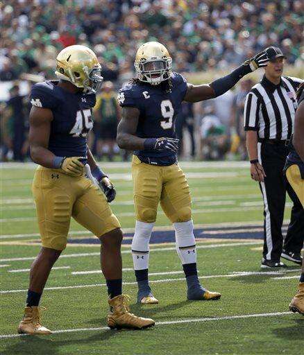 In this Saturday, Sept. 26, 2015 photo, Notre Dame linebacker Jaylon Smith calls out defensive alignments during the first half of an NCAA college football game against Massachusetts, in South Bend, Ind. Jaylon Smith is hard to keep track of. Sometimes he lines up at weakside linebacker spot and rushes the passer. Other times he lines up in the same spot and drops back in coverage. Other times he slides out to play strongside linebacker. Still other times he lines up at defensive end. (AP Photo/Charles Rex Arbogast) The Associated Press