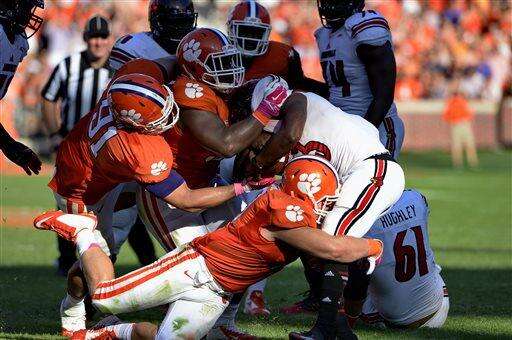 FILE - In this Oct. 11, 2014, file photo, Clemson defenders Jayron Kearse, bottom, Josh Watson, center, and Grady Jarrett tackle Louisville's Brandon Radcliff during an NCAA college football game in Clemson, S.C. Clemson safety Jayron Kearse has already heard _ and read _ too much about Notre Dame standout Will Fuller and the rest of the Fighting Irish receivers. (AP Photo/ Richard Shiro, File) The Associated Press