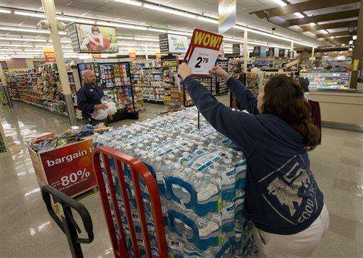 Scan analyst Kristen Nice readies cases of bottled water for sale at the Food Lion in Newport News, Va., Thursday, Oct. 1, 2015, as the grocer brings in extra people for checkout and stocking as residents stock up on food essentials ahead of Hurricane Joaquin. (Adrin Snider/The Daily Press via AP) MANDATORY CREDIT (REV-SHARE) MBO The Associated Press