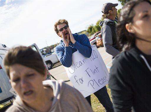 Protesters chant outside of a meeting where city and state officials announce an action plan to deal with lead levels in Flint's drinking water during a news conference on Friday, Oct. 2, 2015, at Kettering University in Flint, Mich. The city is now telling residents to use only cold water for drinking, cooking and making baby formula, and recommending they use the certified filters. (Danny Miller/The Flint Journal-MLive.com via AP) LOCAL TELEVISION OUT; LOCAL INTERNET OUT; MANDATORY CREDIT The Associated Press