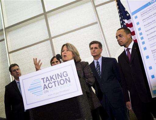 Dr. Eden Wells, center, chief medical executive of the state Michigan Department of Health and Human Services, speaks as city and state officials announce a plan to deal with lead levels in Flint's drinking water during a news conference on Friday, Oct. 2, 2015, at Kettering University in Flint, Mich. The city is now telling residents to use only cold water for drinking, cooking and making baby formula, and recommending they use the certified filters. (Danny Miller/The Flint Journal-MLive.com via AP) LOCAL TELEVISION OUT; LOCAL INTERNET OUT; MANDATORY CREDIT The Associated Press
