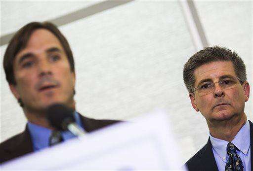 Dan Wyant, right, director of the Michigan Department of Environmental Quality, listens as city and state officials announce a plan to deal with lead levels in Flint's drinking water during a news conference on Friday, Oct. 2, 2015, at Kettering University in Flint, Mich. The city is now telling residents to use only cold water for drinking, cooking and making baby formula, and recommending they use the certified filters. (Danny Miller/The Flint Journal-MLive.com via AP) LOCAL TELEVISION OUT; LOCAL INTERNET OUT; MANDATORY CREDIT The Associated Press